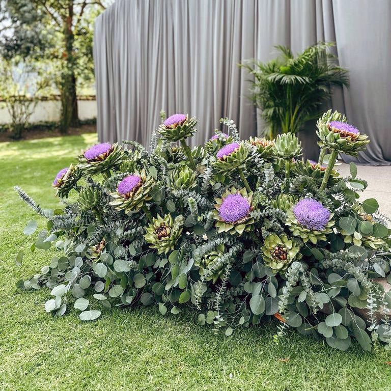 Uba Paradise is often used to decorate outdoor wedding spaces, beautifully paired with other greenery that highlights its distinctive purple hue.